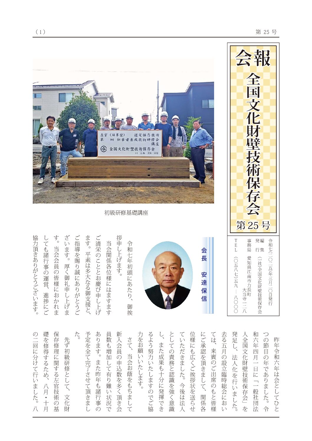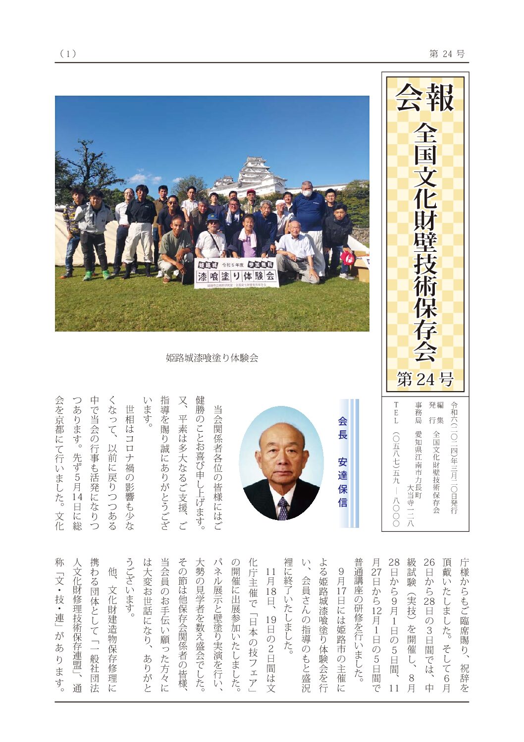■安達会長あいさつ ■中嶋副会長あいさつ ■第32期(令和6年度)総会 ■左官(日本壁)中級研修会(筆記試験) ■左官(日本壁)初級研修会(基礎講座) ■姫路城漆喰塗り体験会 ■文化庁日本の技フェア ■新入会員紹介 ■編集だより ■赤穂城跡公園 二の丸庭園整備工事 西中門復元工事 ㈱山脇組 ■選定保存技術左官(日本壁) 技能者認定者名簿 ■伝承者養成技術研修会 受講修了者名簿 ■伝承者養成技術研修会 中級研修受講修了者名簿 ■会員名簿
